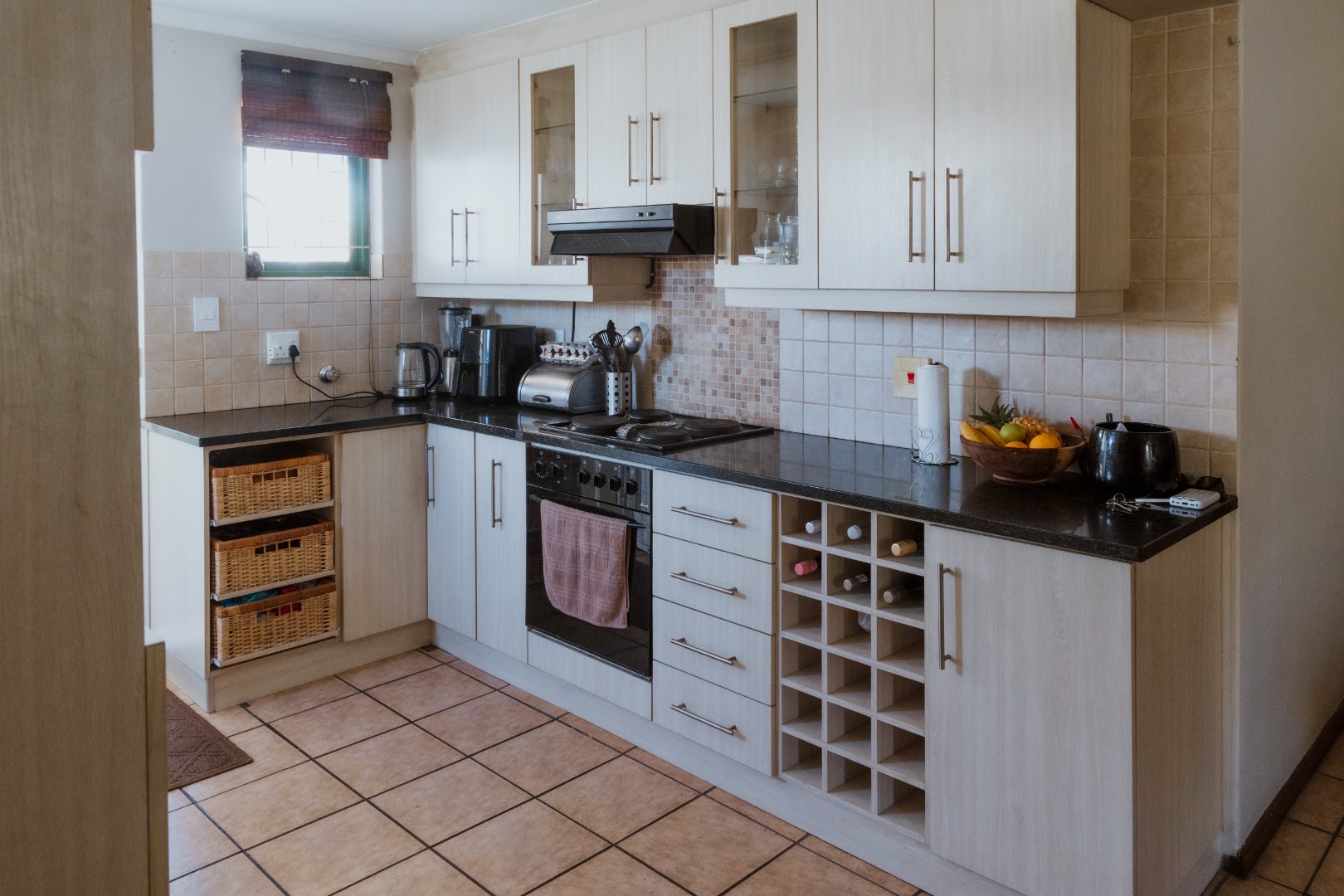 Kitchen with built in cupboards with hob and oven