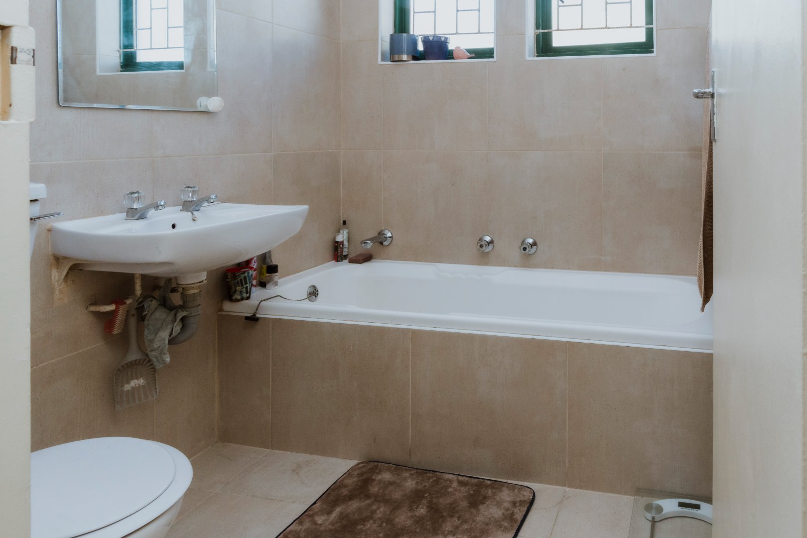 Main bathroom with toilet, basin and bath